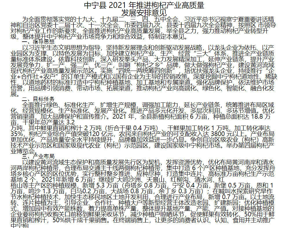 中宁县 2021 年推进枸杞产业高质量 发展安排意见